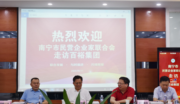 南寧市民營企業(yè)家聯(lián)合會始建于1992年4月,是南寧市成立最早的商會之一。會員行業(yè)涵蓋房地產(chǎn)開發(fā)、融資擔(dān)保、建材、制造、礦業(yè)、餐飲、農(nóng)業(yè)、五金機電、商貿(mào)物流等多個行業(yè),市場已拓展到美國、加拿大、日本、韓國、東盟各國等地。百裕集團董事長許曲煌做為聯(lián)合會執(zhí)行會長,認(rèn)真履行會員企業(yè)的義務(wù)和工作,積極與企業(yè)會員企業(yè)交流學(xué)習(xí)。此次走訪活動中,各企業(yè)家參觀了百裕集團產(chǎn)品展示廳、觀看了集團各分公司、生產(chǎn)中心、研發(fā)中心等相關(guān)視頻短片,并在會議室進行了交流會議。