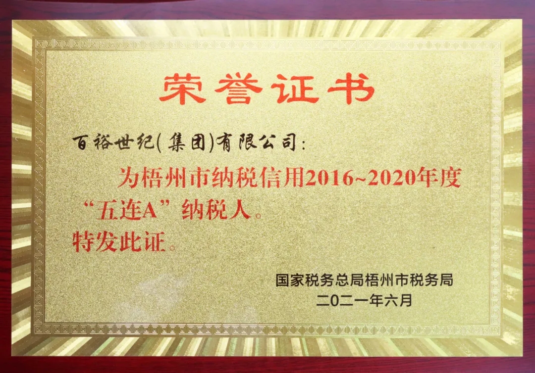 2021年6月,百裕世紀被國家稅務總局梧州市稅務局評定為梧州市納稅信用2016-2020年度“五連A”納稅人榮譽稱號,并頒發(fā)證書。此次評定是繼2016-2019被評為“四連A”納稅人稱號后,國家稅務局進一步對百裕的肯定,體現(xiàn)了百裕的納稅誠信水平。