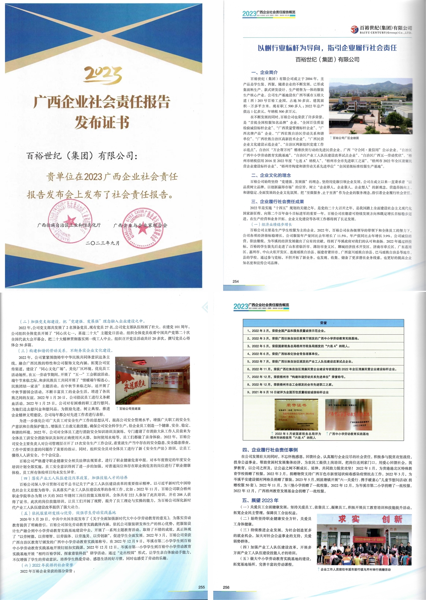 為深入學(xué)習(xí)貫徹黨的二十大精神及習(xí)近平總書記關(guān)于企業(yè)社會責(zé)任建設(shè)的重要指示精神。2023年9月26日下午,由廣西壯族自治區(qū)工業(yè)和信息化廳、廣西企業(yè)與企業(yè)家聯(lián)合會共同主辦的“2023廣西企業(yè)社會責(zé)任報告發(fā)布會暨十年回顧與展望”活動在南寧隆重舉行。廣西區(qū)各大國企央企以及各行業(yè)代表企業(yè)包括百裕集團(tuán)在內(nèi)的近百家企業(yè)齊聚一堂,向社會展示了廣西企業(yè)2022年度履行企業(yè)社會責(zé)任實踐取得的主要成果。會上,百裕集團(tuán)獲頒廣西企業(yè)社會責(zé)任報告發(fā)布證書。