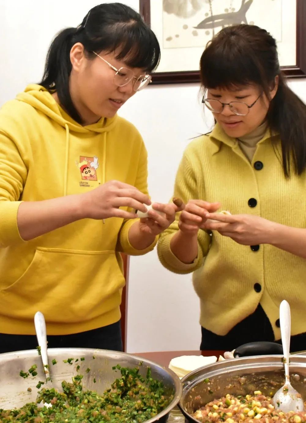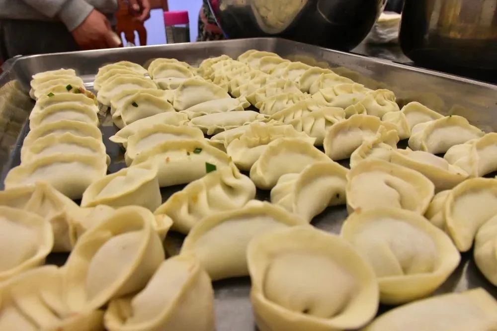 新春伊始,大家齊聚餐廳各顯神通,放餡、捏皮,完整連貫。一會(huì)兒功夫,一盤盤大小勻稱、緊實(shí)飽滿、形狀美觀的餃子整齊地?cái)[上了臺(tái)面:月牙狀、元寶狀、柳葉狀等各式各樣的餃子組成了一桌餃子“全家?!保氨染阑ǘ浒倩R放。