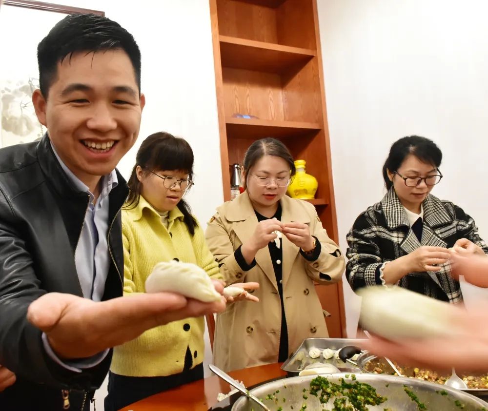 餐廳里歡聲笑語,熱鬧非凡,大家邊包餃子邊拉家常,相互觀摩學(xué)習(xí),加深了彼此的交流,拉近了彼此的距離,增進(jìn)了彼此的感情。