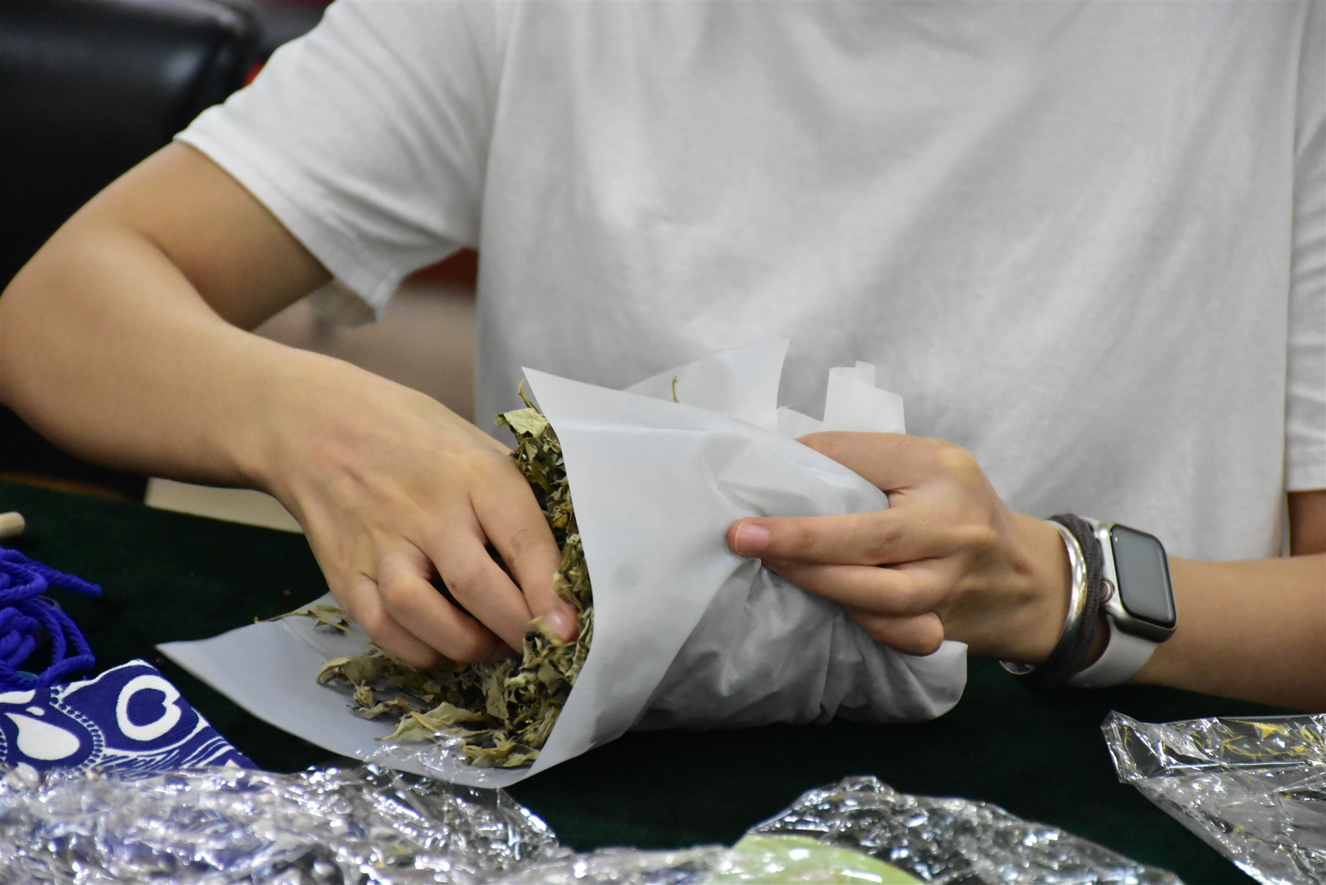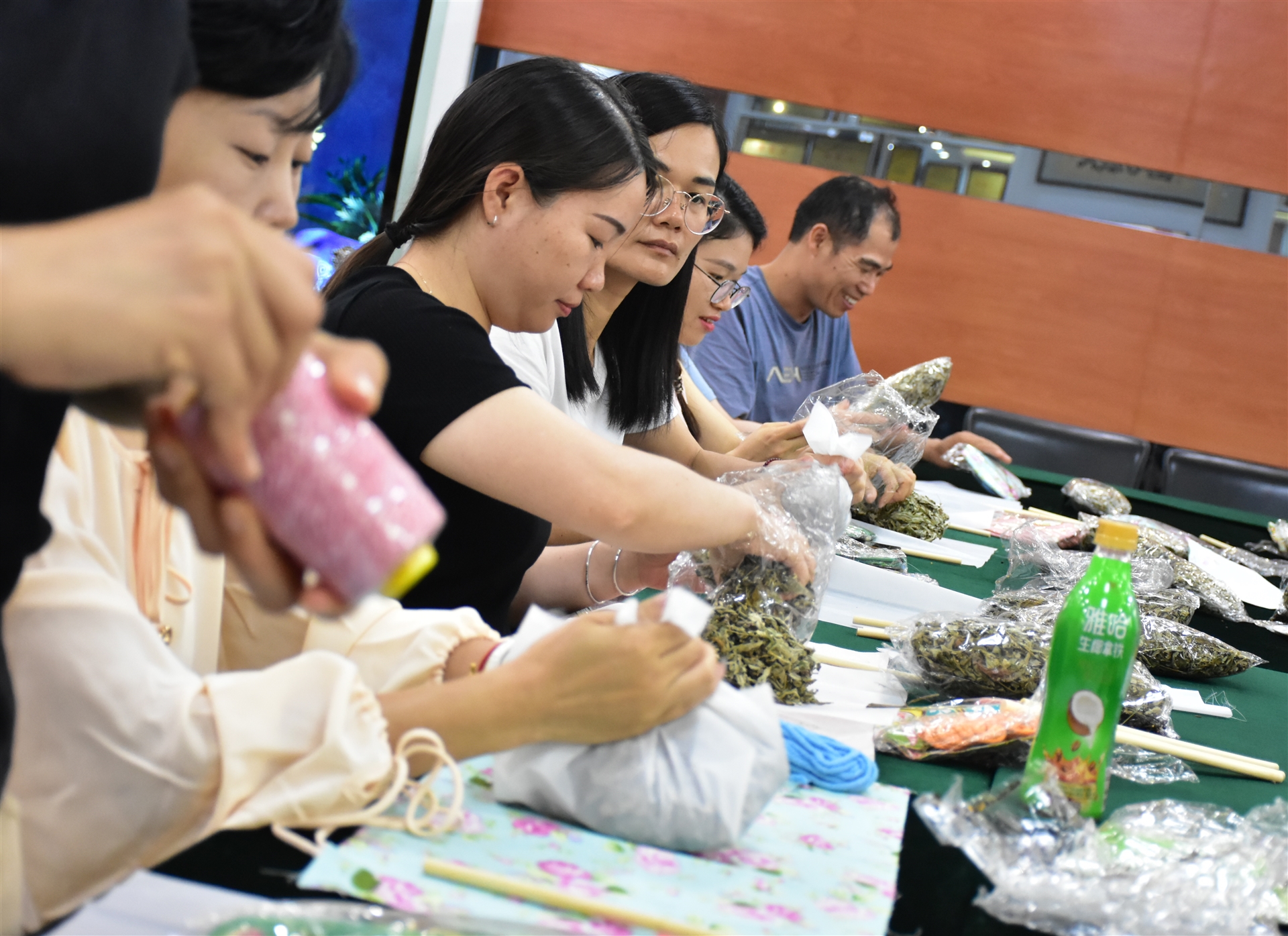 會議室被精心布置,桌上整齊擺放著艾草、彩線、小剪刀等制作材料,以及為員工準備的粽子和水果,營造了一個充滿節(jié)日氛圍的環(huán)境。